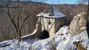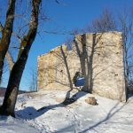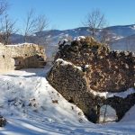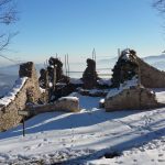 Muráň v zime 8 – zvyšky kaplnky a v pozadí majestátny vrch Kohút