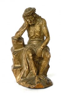 „Drobná plastika predstavuje postavu Krista odetú v bedernej rúške s tŕňovou korunou ako sedí na skale a pravou rukou si podopiera sklonenú hlavu. Výška sošky je len 16 cm,“ opísala predmet Kolár.