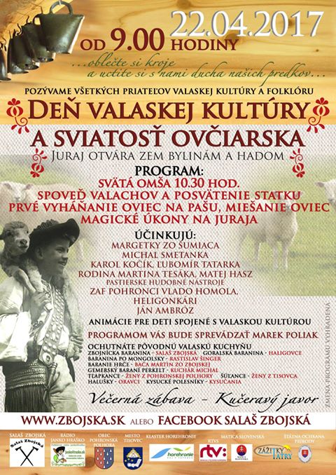 Na Salaši Zbojská sa bude oslavovať sviatosť ovčiarstva a vy môžete byť pri tom. „V sobotu 22. apríla je pre verejnosť pripravená spoveď valachov, prvé vyháňanie oviec na pašu, magické úkony na Juraja a animácie pre najmenších spojené s valaskou kultúrou. Okrem kultúrneho programu a večernej zábavy si môžete pochutnať aj na dobrotách valaskej kuchyne, medzi ktorými nebude chýbať pečená baranina, halušky, baraní perkelt či šúľance,“ avizovala manažérka MAS.