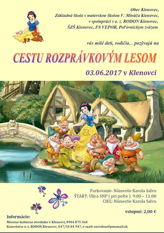 Na cestu rozprávkovým lesom sa môžete vydať v Klenovci, kde od 9:00 na Ulici SNP na deti čaká niekoľko zastavení s rozprávkovými bytosťami, rôznymi úlohami a sladkými odmenami. O deň neskôr ( nedeľa 4. júna) je pripravený bohatý program ku Dňu detí aj v Revúcej.