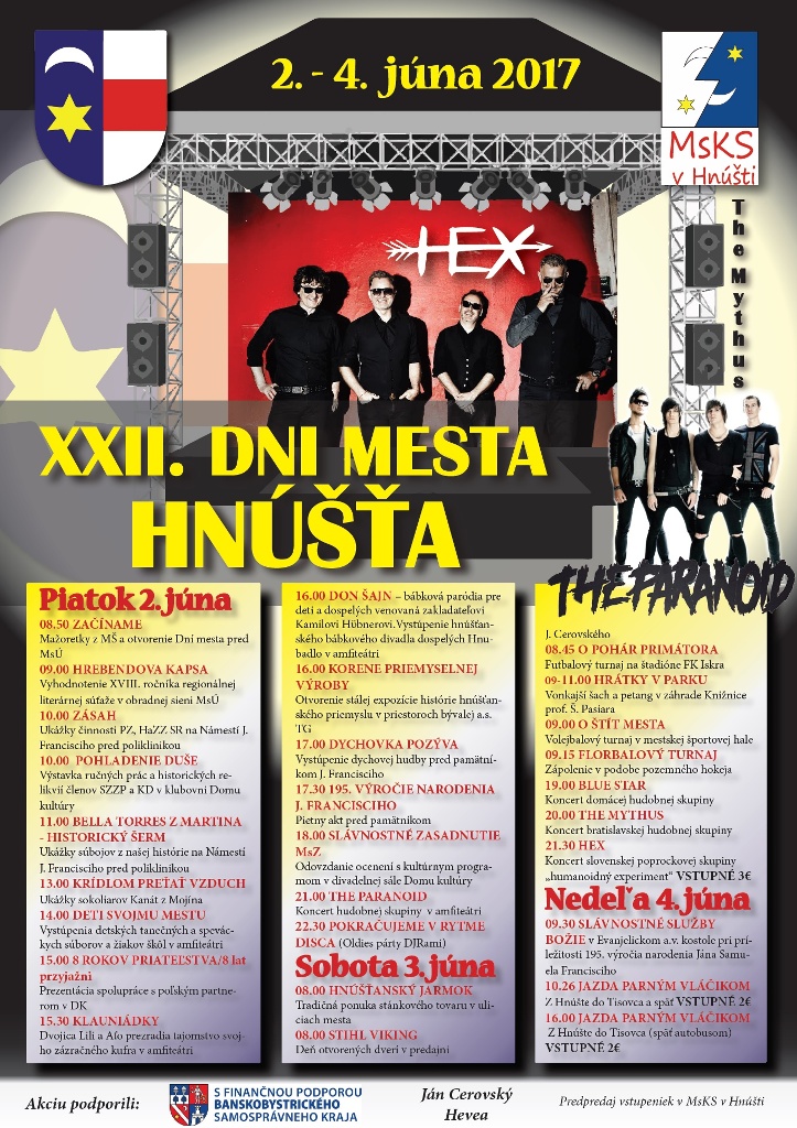 Prvý júnový víkend sa bude niesť v duchu osláv Dní mesta Hnúšťa. Pestrý piatkový program (2. júna) s ukážkami sokoliarov, detskými vystúpeniami a zaujímavými výstavami vyvrcholí koncertom hudobnej skupiny The Paranoid. „Sobota bude patriť už tradične jarmoku, športovým turnajom a koncertu skupiny Peter Bič Projekt. Ani tento rok nebude chýbať jazda parným vláčikom z Hnúšte do Tisovca a späť. Vláčik vyráža z vlakovej stanice v nedeľu 4. júna o 10:26 a 16:00,“ konkretizovala Vargová.