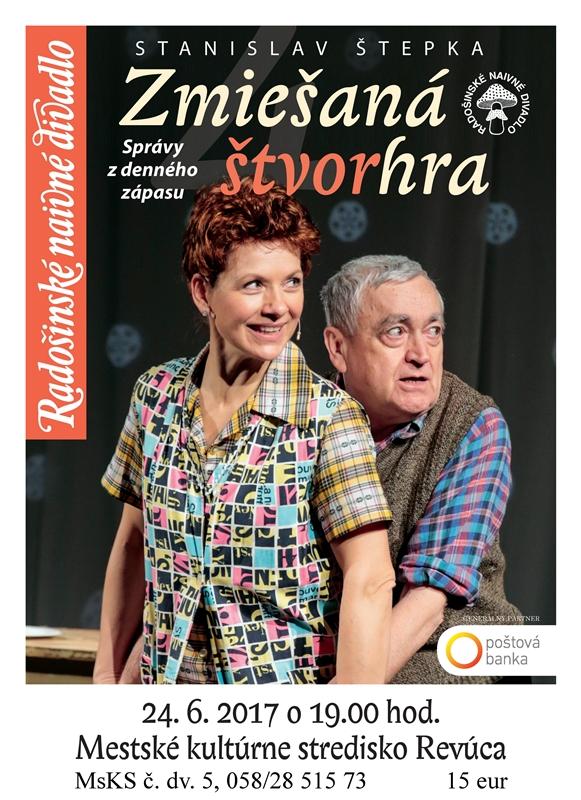 Do Revúcej zavíta v sobotu 24. júna o 19:00 Radošinské naivné divadlo s komediálnou hrou Zmiešaná štvorhra. Prostredníctvom humoru, satiry a vtipného hereckého stvárnenia prinesie pohľad do života dvoch úplne odlišných slovenských rodín.