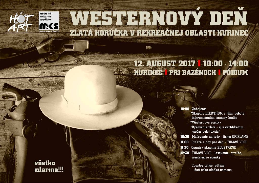 Pre deti aj dospelých sa v rekreačnej oblasti Kurinec pripravuje Westernový deň. V sobotu 12. augusta od 10:00 do 14:00 môžete cez rôzne súťaže, hry, atrakcie, hudbu či tanec zažiť ozajstnú country atmosféru. „Nebude chýbať ani ryžovanie zlata, lasovanie, streľba či westernové scénky v podaní Túlavých vlkov,“ načrtla Vargová. O hudobný program sa postarajú rimavskosobotské country kapely Elektrum a Bluetrend.