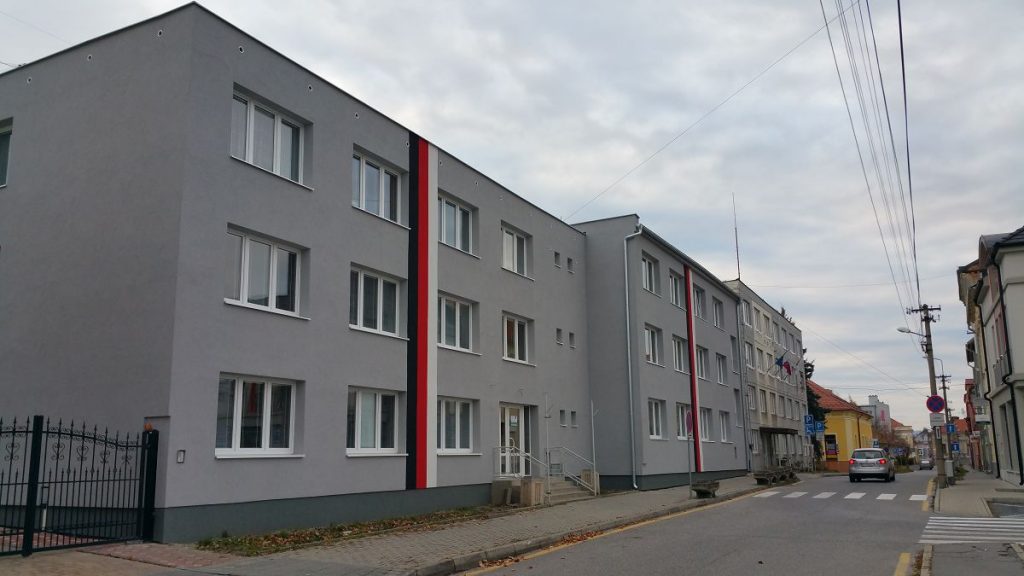 RIMAVSKÁ SOBOTA – Rekonštrukcia budov Mestského úradu na Svätoplukovej ulici sa pomaly blíži ku koncu. Najlepšie je to vidieť na dvoch budovách, ktoré už majú hotovú fasádu a pribudla na nich i trikolóra vo farbách mesta – červenej, čiernej a bielej.