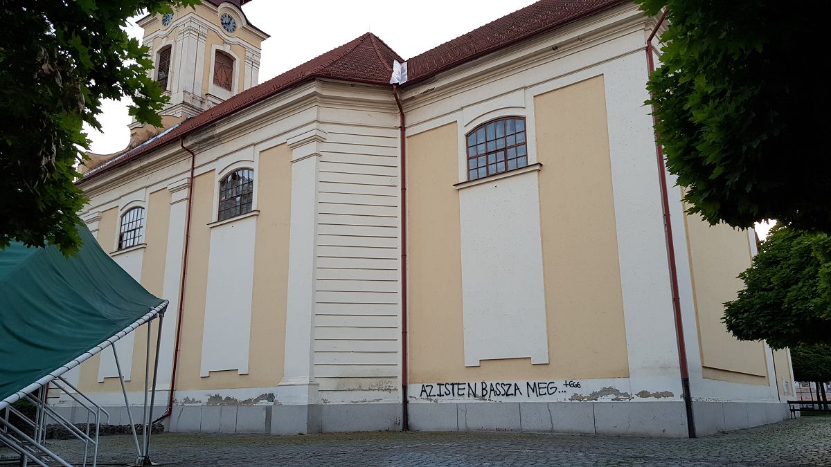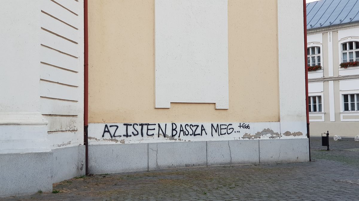 K nápisu „Az isten bassza meg...“ (v preklade „Nech to boh pojebe…“) pridal aj symbol prevráteného kríža používaný satanistami, ako aj číslo 666, ktoré má byť označením Antikrista. Podľa údajov z kamerového systému mestskej polície došlo k nastriekaniu nápisu niekedy v noci zo soboty 19. mája na nedeľu 20. mája.