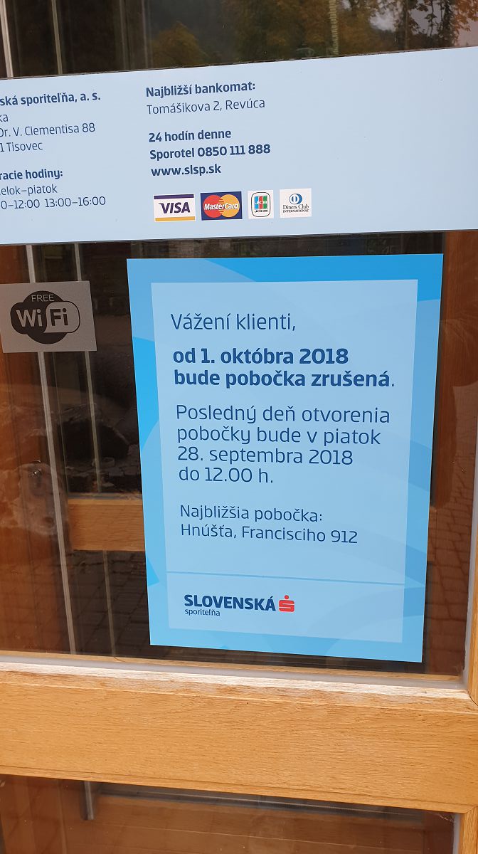 V minulosti mala v Tisovci pobočku aj Všeobecná úverová banka, zrušila ju však už pred viac ako desiatimi rokmi. Po aktuálnom zrušení pobočky SLSP majú Tisovčania najbližšiu „kamennú“ pobočku banky v 12 kilometrov vzdialenej Hnúšti, prípadne v Revúcej a Brezne, kam treba cestovať 20, resp. 30 kilometrov.