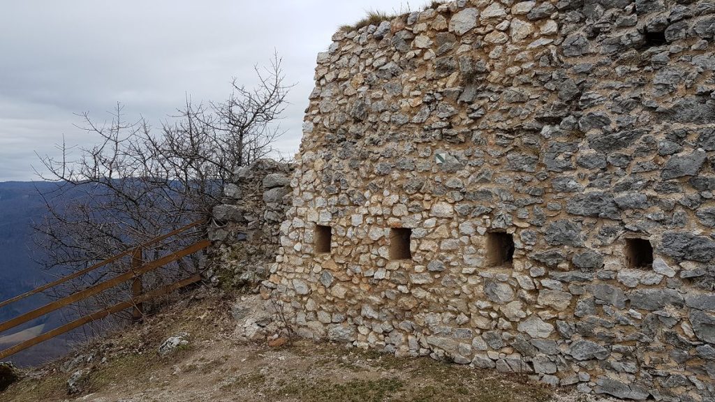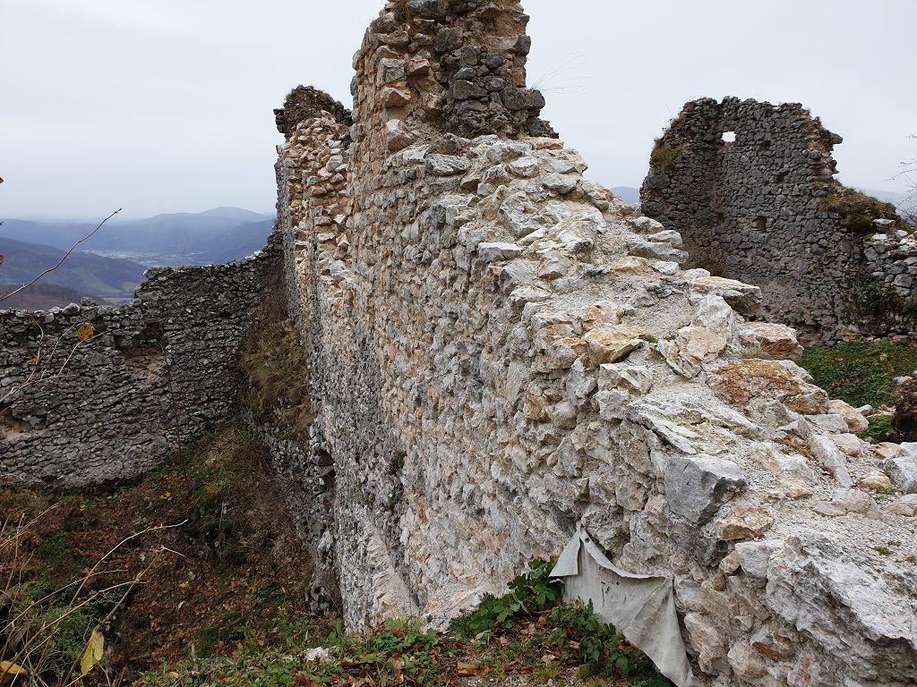 Časť zachovanej hradby pri južnej vyhliadke. Vľavo dole je vidieť doplnenú časť, kde bol v minulosti výpadok muriva.