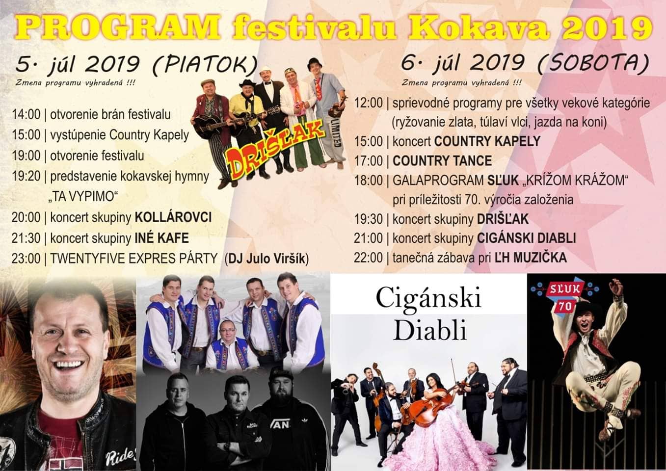 Na festivale privítajú tiež ORCHESTER CIGÁNSKI DIABLI – GYPSY DEVILS, ktorý už niekoľko rokov úspešne reprezentuje Slovensko po celom svete. O večernú zábavu sa postará hudobné zoskupenie DRIŠĽAK. Festival Kokava 2019 ukončí tanec a spev so skvelou ĽUDOVOU HUDBOU MUZIČKA z Bratislavy.