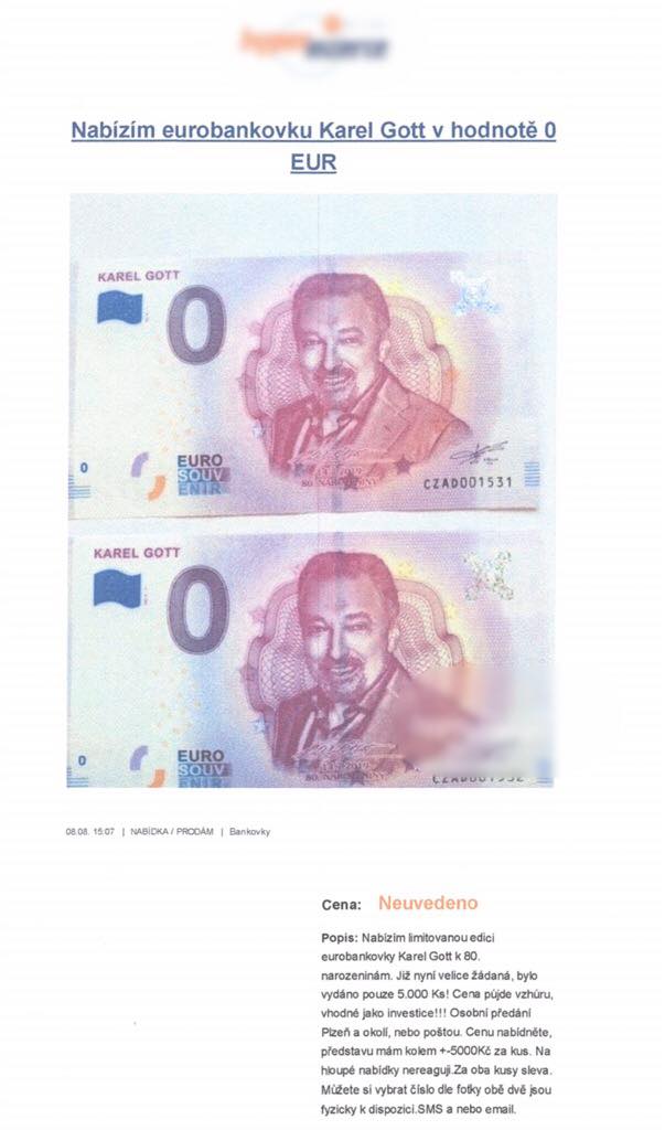 LUČENEC – Polícia v Lučenci vyšetruje podvod, pri ktorom prišiel poškodený o viac ako 300 eur. Podľa policajtov zareagoval na známom inzertnom portáli na inzerát, ktorý ponúkal na predaj dve eurobankovky v nominálnej hodnote 0,- € z limitovanej edície „Karel Gott k 80. narozeninám“ za 5.000 českých korún (CZK) za kus.