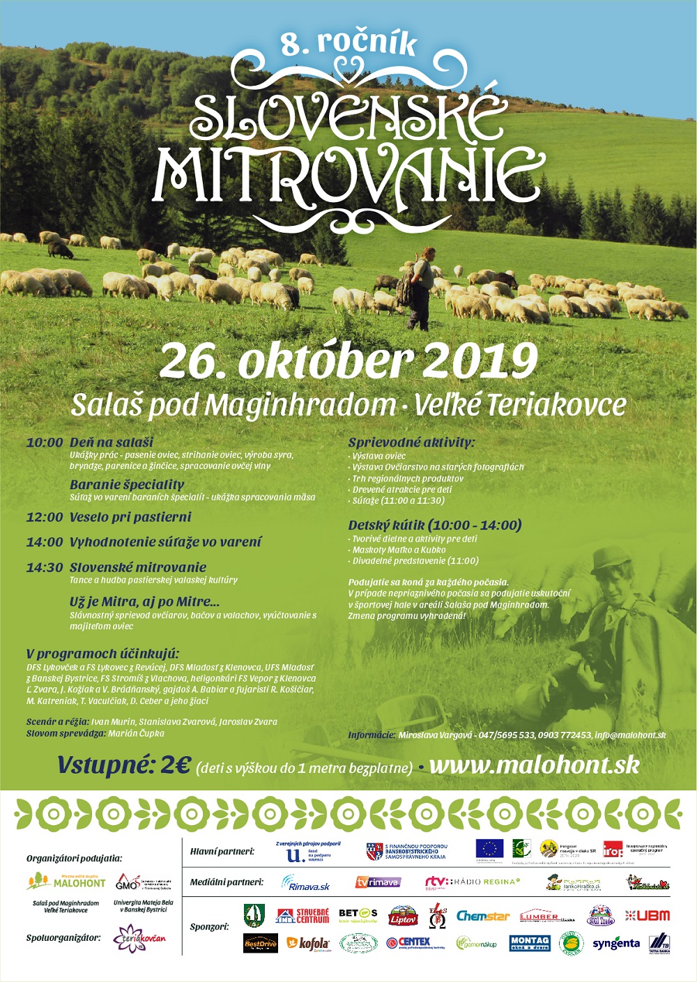 Ukážka prác na salaši, tanec a hudba pastierov, Maťko a Kubko v nadživotnej veľkosti. Toto a plno ďalšich ľudových tradícií a zaujímavostí môžete uvidieť v sobotu 26. 10. 2019 na Salaši pod Maginhradom v obci Veľké Teriakovce kde sa bude konať už 8. ročník Slovenského mitrovania. Podujatie sa začne o 10:00. Vstupné je 2 €, pre deti do jedného metra je vstup voľný. Hlavným organizátorom je MAS Malohont.