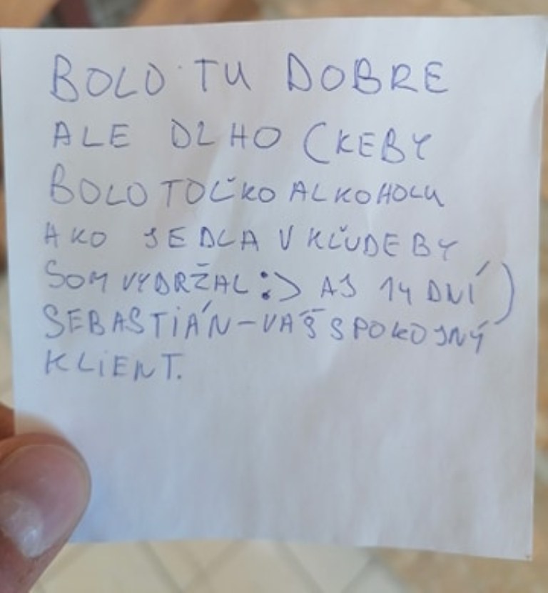 To, že sa o navrátilcov starali zamestnanci školy poctivo a dôsledne, svedči fakt, že im nechali viaceré milé a pozitívne odkazy. O jednom informovala aj riaditeľka Vašová na svojom Facebooku. Spokojný klient Sebastián napísal toto: „Bolo tu dobre, ale dlho (keby bolo toľko alkoholu ako jedla, v kľude by som vydržal aj 14 dní).“
