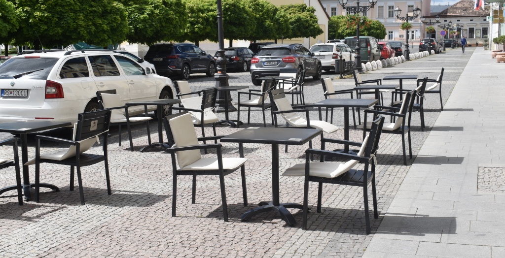 Naše prvé kroky viedli na terasu kaviarne Tatra na Hlavnom námestí. Okolo 14:00 tam nebol ani jeden človek. Keď sme sa tam vrátili asi o hodinu, rovnako sme nikoho vo vonkajších priestoroch kaviarne nevideli. Druhý podnik priamo na Hlavnom námestí, Tri ruže, bol úplne zaplnený, no vonku boli len tri stoly, okolo ktorých sedelo osem ľudí.
