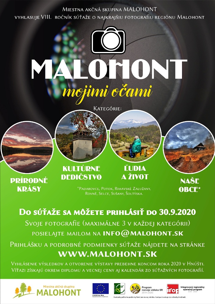 „Fotosúťaž poskytuje možnosť poukázať na to najlepšie, čo v regióne Malohont a jeho okolí máme – na miesta, pamiatky, ľudí i udalosti, ktoré zaujmú oko domáceho i toho fotografa, ktorý sa sem práve vďaka nim stále rád vracia,“ uviedli organizátori v tlačovej správe. Ako ďalej doplnili, súťažiť sa bude v štyroch kategóriách: Prírodné krásy (stromy, jaskyne, rybníky, skalnaté útvary, vodné toky a pod.), Kultúrne dedičstvo (kultúrne a historické pamiatky, pamätihodnosti, tradičná architektúra, tradičné podujatia, uchovávanie zvykov, remeslá a pod.), Ľudia a život (ľudia pri práci, deti, rôzne aktivity realizované v regióne a pod.) a Naše obce (akékoľvek zábery z obcí Padarovce, Potok, Rimavské Zalužany, Rovné, Selce, Sušany a Šoltýska – momentky, detaily, ľudia pri práci, zaujímavosti obcí a pod.).