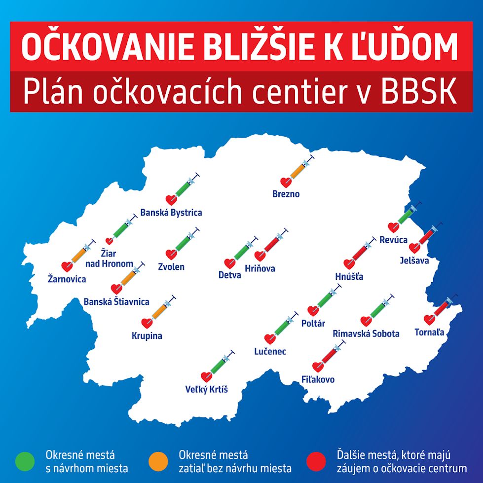 Cieľom kraja je v prvej vlne sprevádzkovať očkovacie centrum s kapacitou aspoň 500 ľudí denne v každom spádovom okresnom meste. V našich regiónoch ide konkrétne o Veľký Krtíš, Lučenec, Poltár, Rimavskú Sobotu a Revúcu. V ďalších obdobiach majú prísť na rad zvyšné mestá v kraji. V tejto chvíli prejavili záujem o zriadenie očkovacieho centra mestá Fiľakovo, Jelšava, Hnúšťa a Tornaľa.