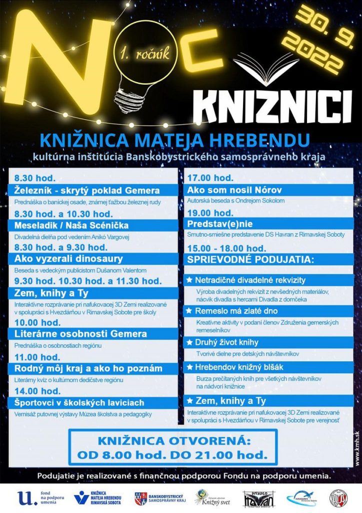 RIMAVSKÁ SOBOTA – Viacero podujatí čaká na návštevníkov tradičnej akcie Noc v knižnici, ktorú dňa 30. septembra 2022 od 8:00 organizuje Knižnica Mateja Hrebendu v Rimavskej Sobote. Inštitúcia o nich informovala v tlačovej správe.