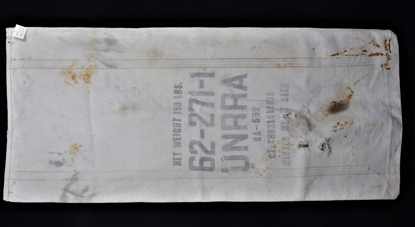 „Prezentovaný zbierkový predmet, ktorý je svedkom významných historických udalostí, pochádza zo 40. rokov 20. storočia, približne z obdobia medzi rokmi 1945-1947. Je to biele plátenné vrece so žltými a modrými pásikmi na boku, a na prednej strane s potlačeným nápisom NET WEIGHT 150 LBS, 62-271-1, UNRRA CZECHOSLOVAKIA. WINTER WHEAT SEED (semená zimnej pšenice),” priblížil Kerepesi.