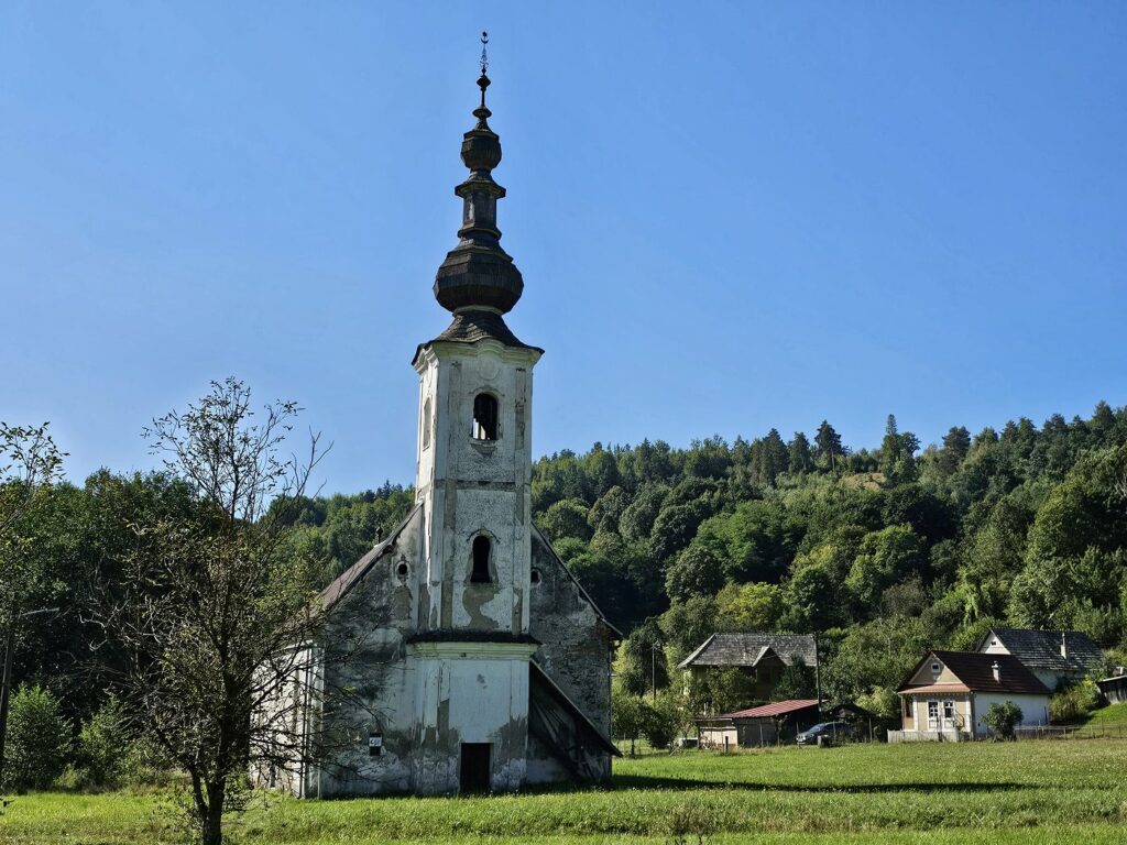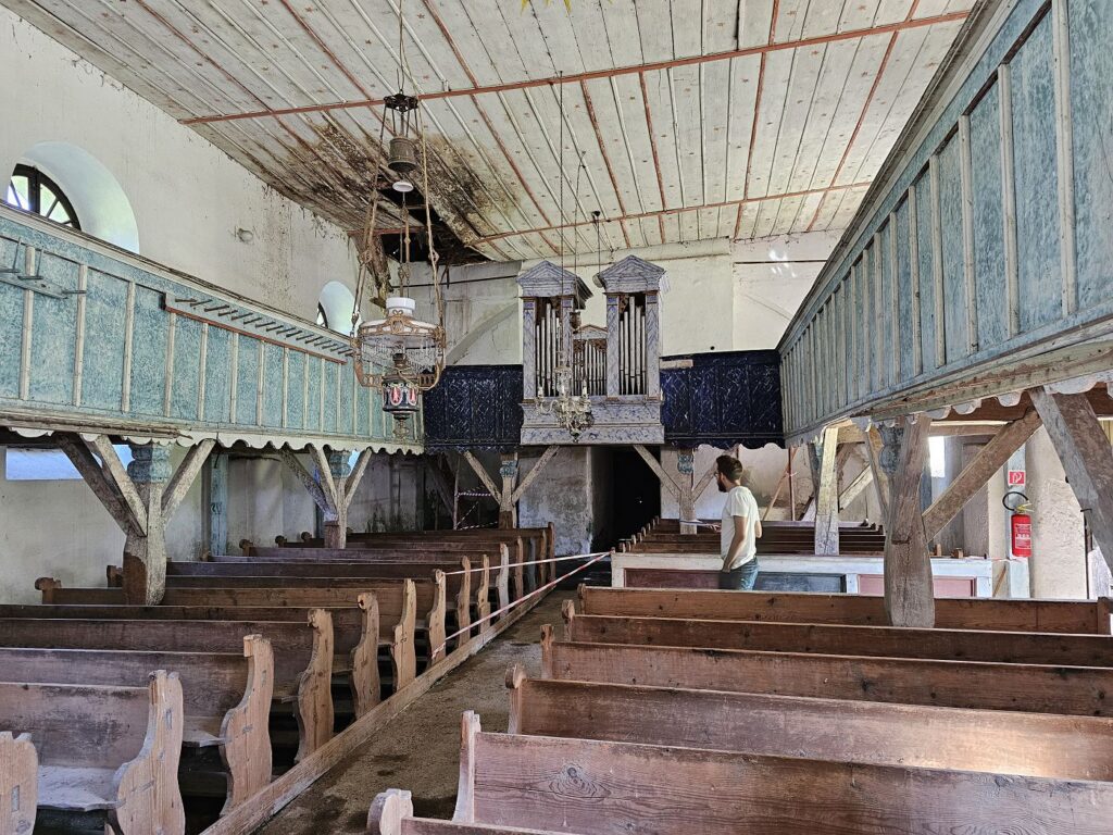 Samotný chrám je v ešte horšom stave ako ten na Brádne. Našťastie, má novú plechovú strechu, ktorá ho chráni pred nepriazňou počasia, ale strop je vo veľmi zlom stave a musí byť podoprený výstužami. Z vnútorného vybavenia sa zachovali len torzá.