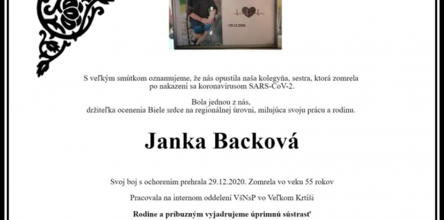 Vo veku 55 rokov zomrela Janka Backová, zdravotná sestra, ktorá pracovala na internom oddelení vo Všeobecnej nemocnici s poliklinikou vo Veľkom Krtíši. Zomrela 29. 12. 2020 po nakazení ochorením COVID-19, ktoré spôsobuje nový koronavírus. Celý článok Prvá zdravotná sestra, ktorá zomrela na COVID-19, pracovala vo V. Krtíši